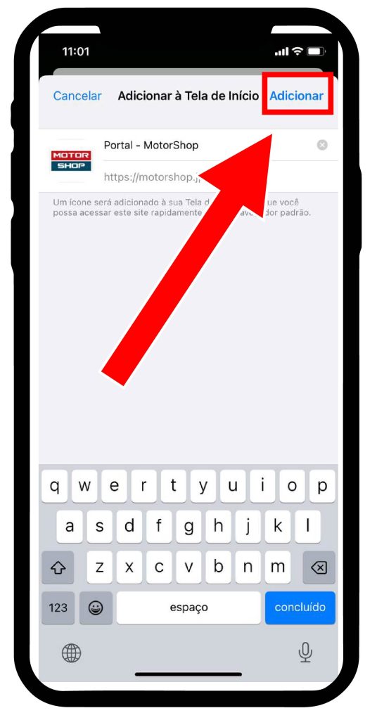 A tela Adicionar à página inicial é exibida. Digite o nome que deseja que apareça no atalho e toque em Adicionar.